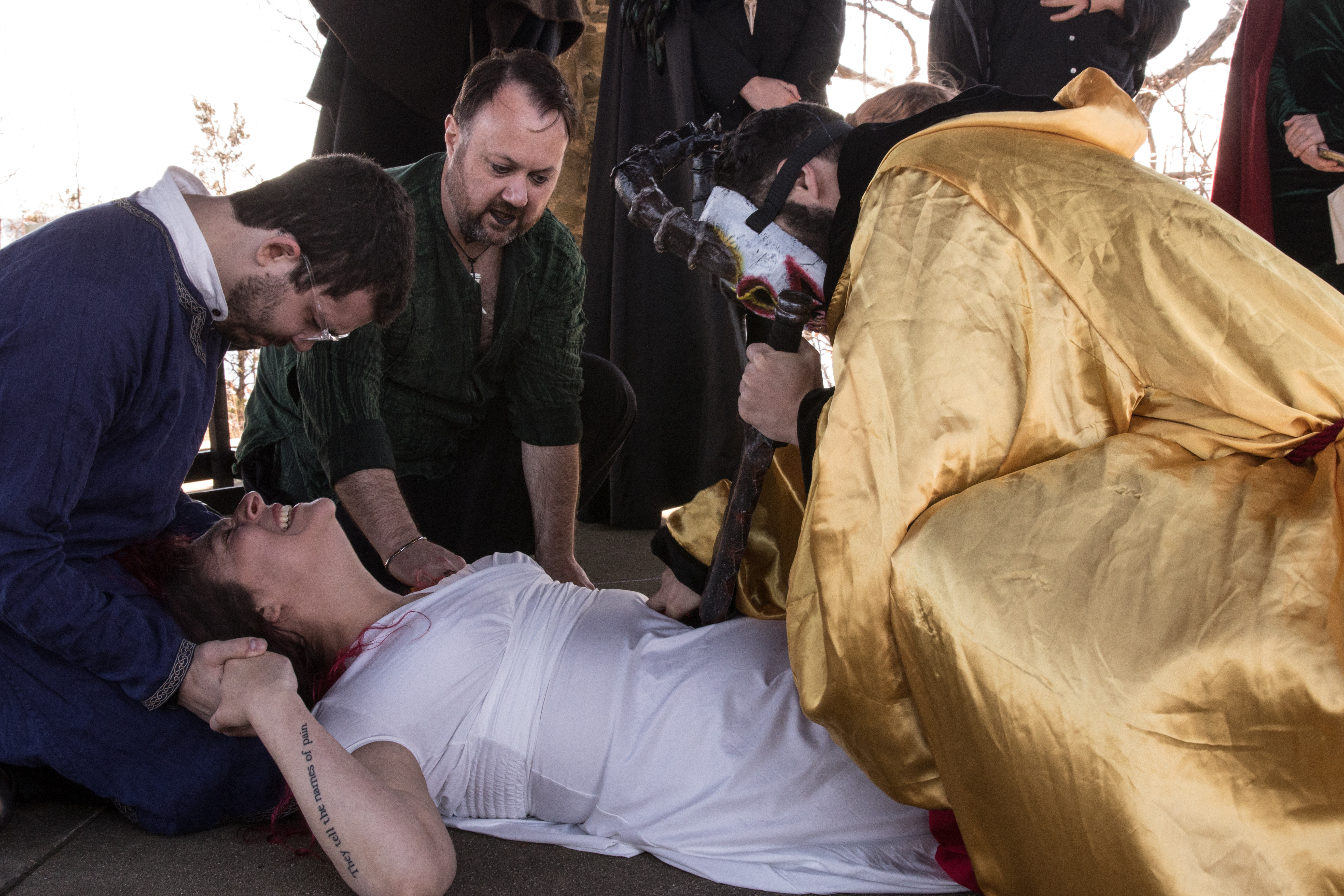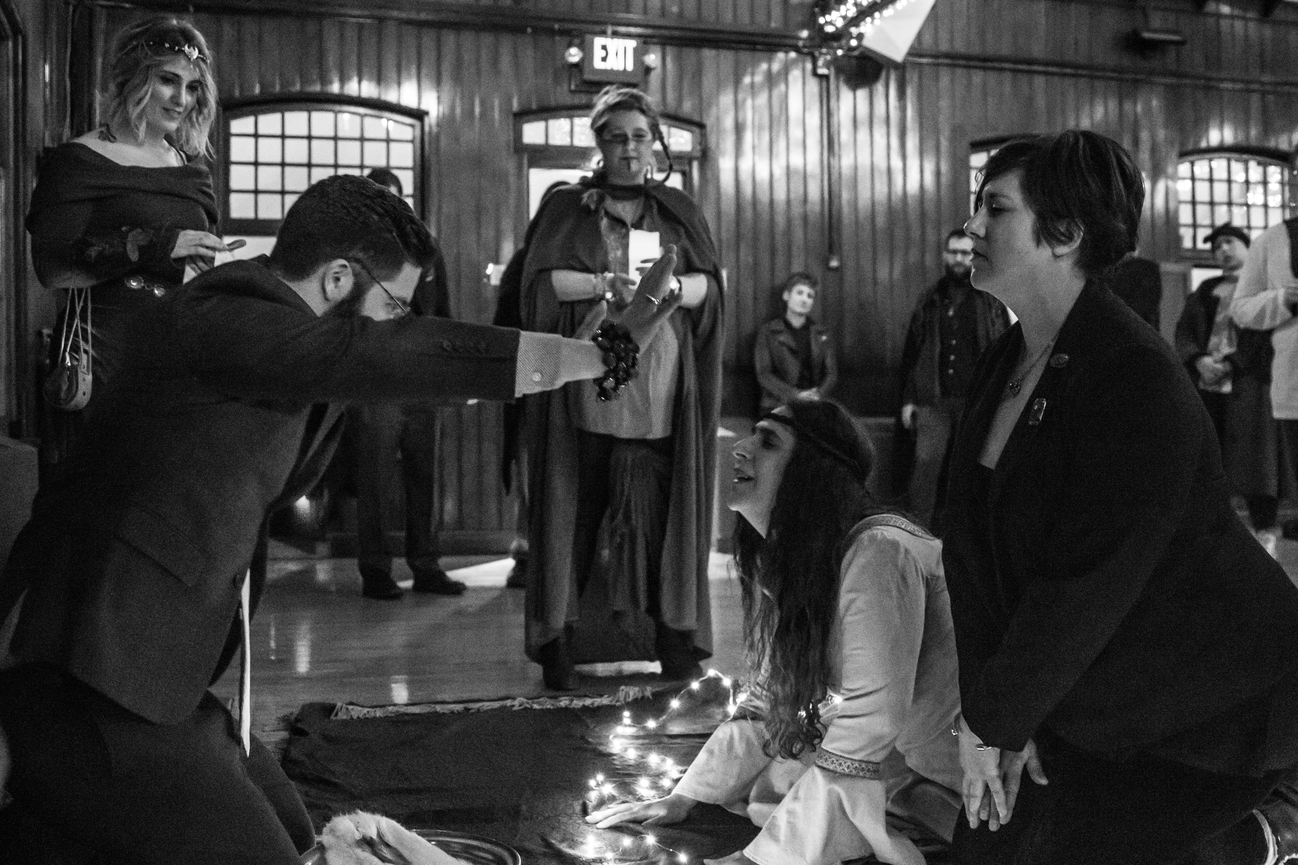 The Workshop Rituals: If I could put one overarching motif on the game, it was rituals. Everywhere you looked, a ritual was happening. Miranda helped us character build through rituals and the cross-faction character emotions it created was amazing. She hid little props throughout the entire workshop room. After the rules were reviewed, she instructed all of us to get into our character bodies. We then walked around the room and found a prop that spoke to our character. We were to figure out what deep meaning it had to our character. Then she instructed us to walk around the room and find someone we thought it should belong to, then tell them why they should have it. It got the participants quickly into the mind of Yes-Anding, build a basic ritual for them, and created some intense moments between non-related characters in a way I’ve never seen in a workshop before. I’m going to modify and steal this (with credit to Miranda) for some of my own workshops in the future.
